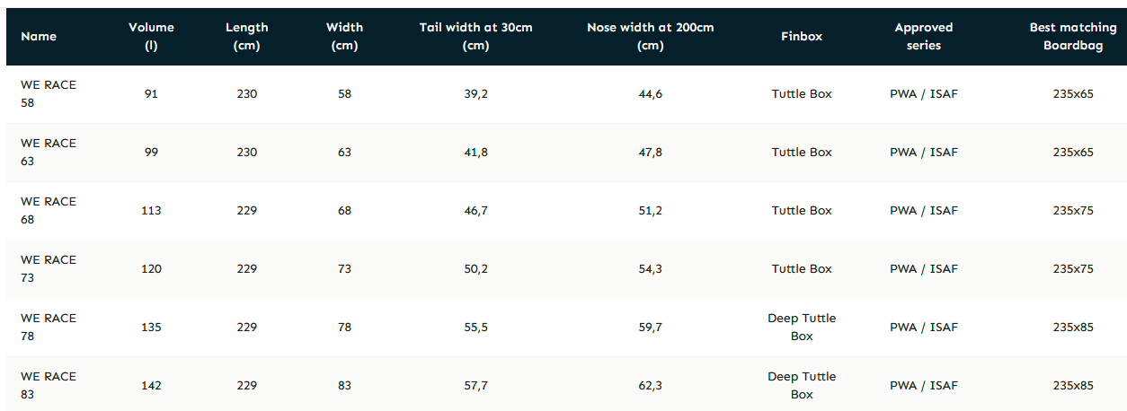 The two smaller boards have been developed as high wind allrounders, where control and top speed are the main goals. Both the 58 and the 63 are made for high wind slalom and rough water control, but with the tail release free enough to enjoy those lighter wind speed days. The smooth rocker lines combined with the well foiled rails make the boards a total pleasure to jibe and accelerate like a lightning.